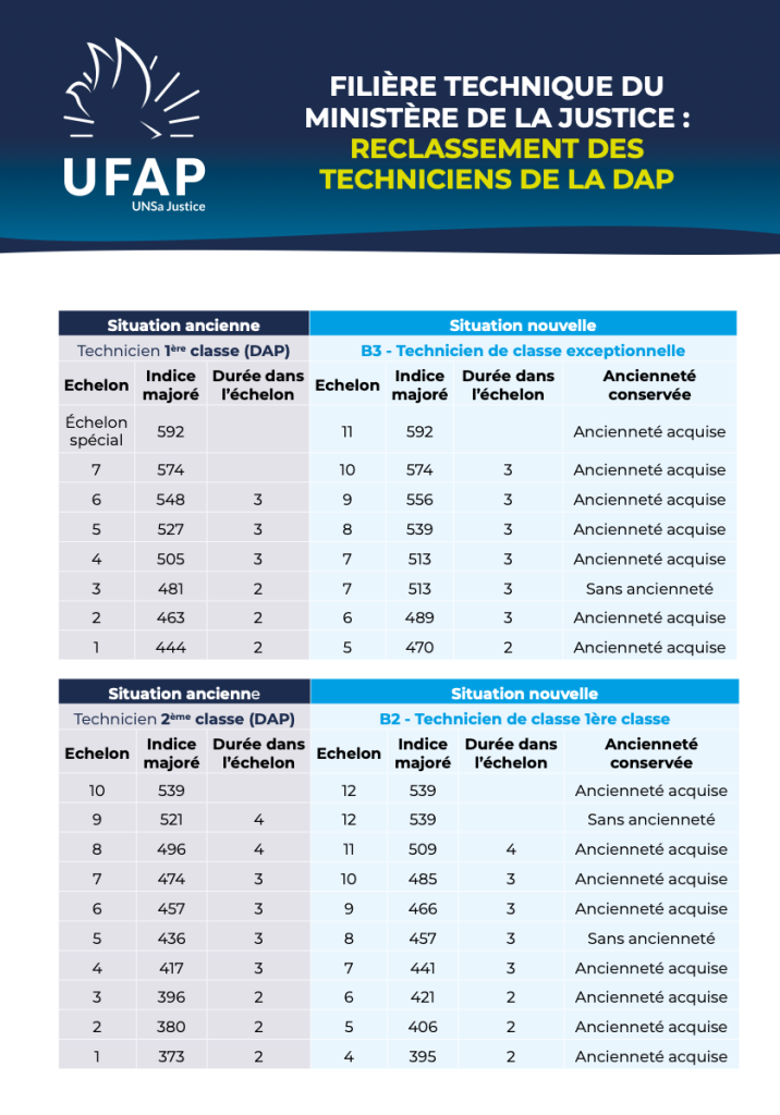 Suite à la création de la filière technique ministérielle, les techniciens de la DAP seront reclassés dans les 2e et 3e grades du corps des techniciens du ministère de la Justice rétroactivement au 1er janvier 2026 comme le montre le flyer en pièce jointe