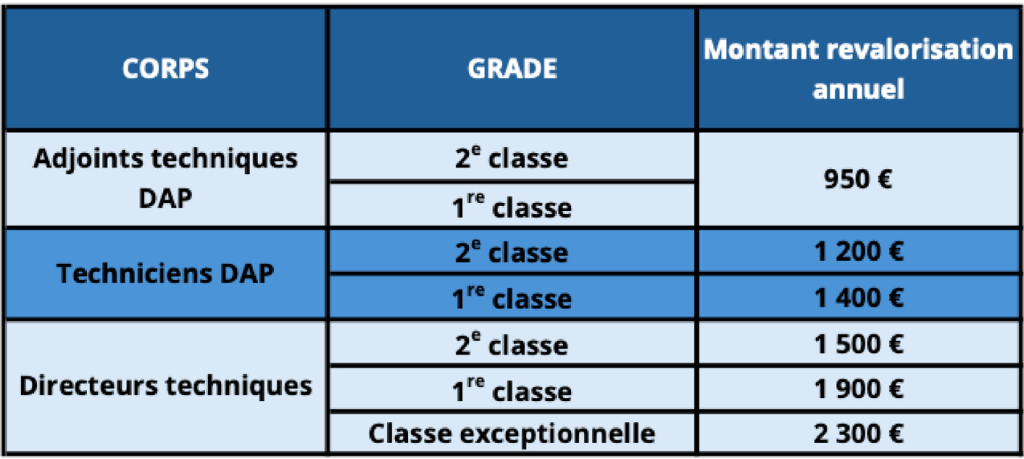 Ces revalorisations dépendent du corps et du grade des agents de l’ancienne filière DAP et se déclinent de la manière suivante :