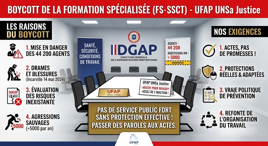 En conséquence, l’UFAP UNSa Justice fait le choix de boycotter cette formation spécialisée. Ce boycott est le signal clair d’une situation devenue explosive. Les personnels sont à bout, confrontés chaque jour aux accidents de service, aux agressions et aux carences répétées de l’administration. Aujourd’hui, les agents sont pris dans un véritable étau : d’un côté, plus de 5 000 agressions par an ; de l’autre, une administration incapable d’apporter des réponses concrètes, ni sur l’accompagnement individuel des personnels, ni sur une véritable organisation collective du travail.