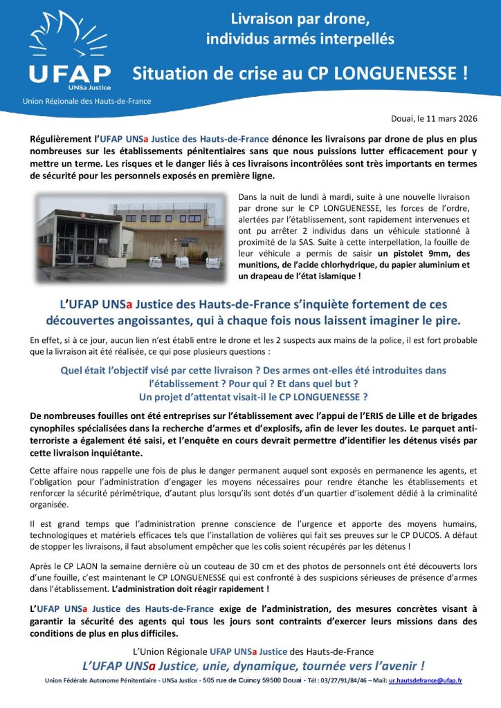 Régulièrement l’UFAP UNSa Justice des Hauts-de-France dénonce les livraisons par drone de plus en plus