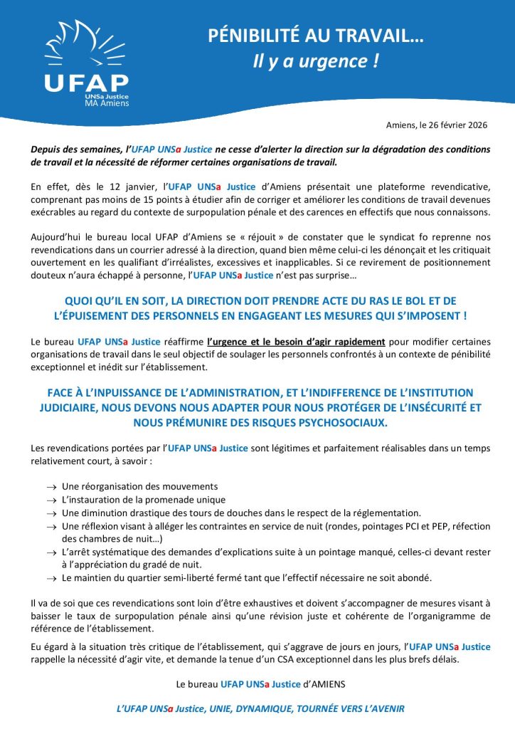 En effet, dès le 12 janvier, l’UFAP UNSa Justice d’Amiens présentait une plateforme revendicative,