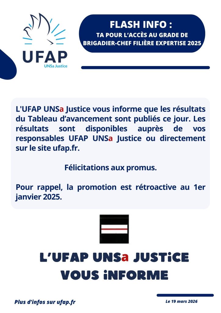 Veuillez trouver sur votre espace adhérent ou auprès de vos responsables UFAP UNSa Justice, la liste des candidats admis au concours de Brigadier Chef Pénitentiaire de la filière « Expertise » pour l’année 2025.