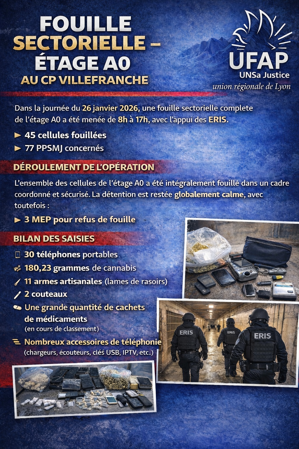 Le 26 janvier 2026, une fouille sectorielle complète de l’étage A0a été menée de 8h à 17h, avec l’appui des ERIS, portant sur 45 cellules.