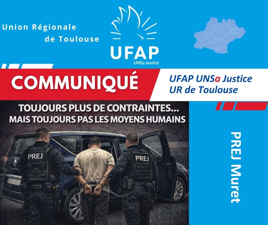 L’UFAP UNSa Justice PREJ Muret exige une préparation rigoureuse des missions, une lecture cohérente des risques, et surtout une politique de sécurité qui ne s’arrête pas aux seuls moyens de contrainte, mais qui intègre enfin pleinement la question des effectifs.